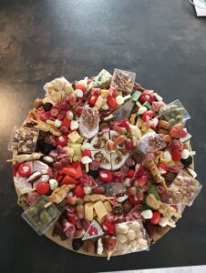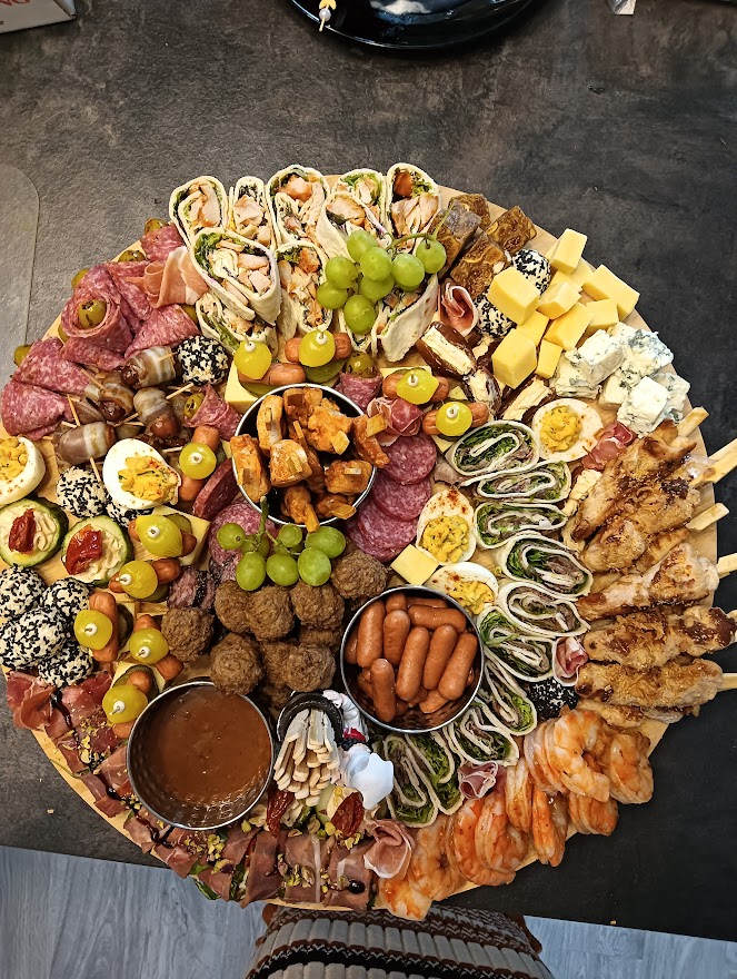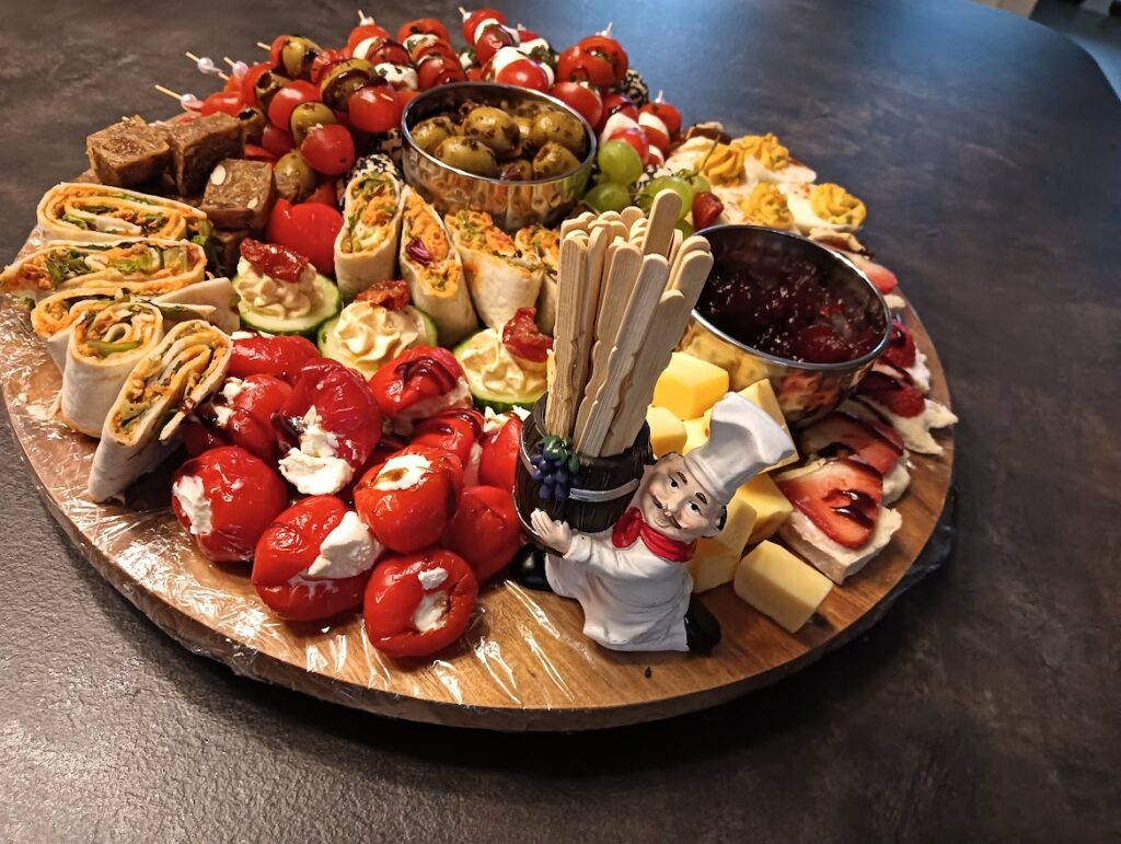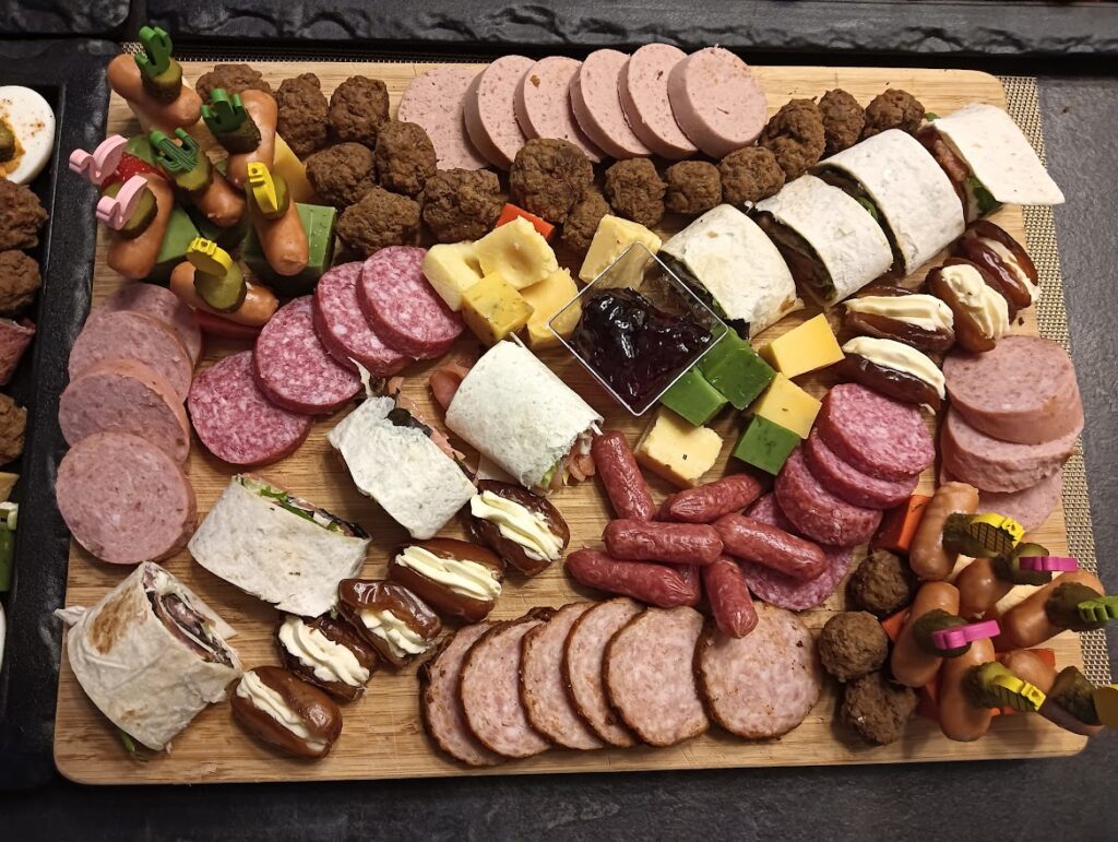 kaas augurk en ui, ham meloen, brie jam, gedroogde tomaat mozzarella, gehaktballetje knakworst, salami, druifjes, wrap vlees , grilworst