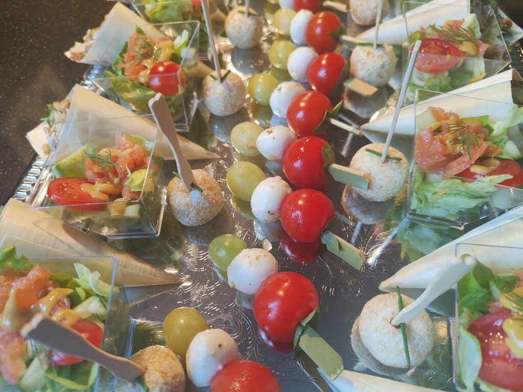 olijf met cervelaat, brie met aardbei, rauwe ham mozzarella, wrap carpaccio , stukjes kaas assorti, dadels met spek, gehaktballetje, kipspiesje, geitenkaas abrikoos sesam, wrap kipfilet en grote garnaal