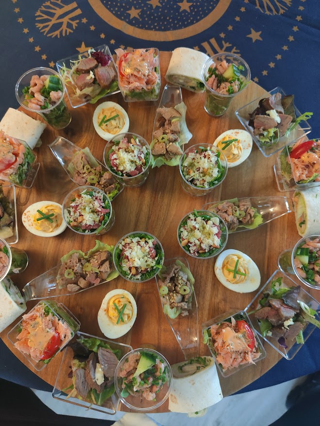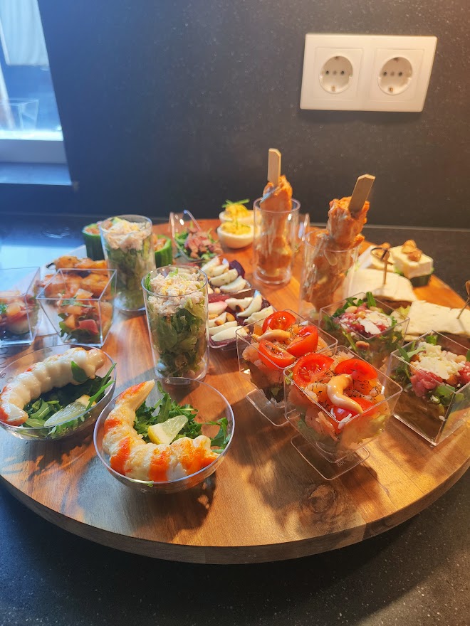 zalm cocktail, garnalencocktail, kipcocktail, rund carpaccio, biefstuk soja, varkenshaas sesam, eendenborst sinaasappel, paling rode biet, geitenkaas balletjes, paté , grote garnalen, mozzarella rauwe ham en gedroogde tomaat, brie met aardbei, tonijn met soja ketjap en wrap vlees of vis