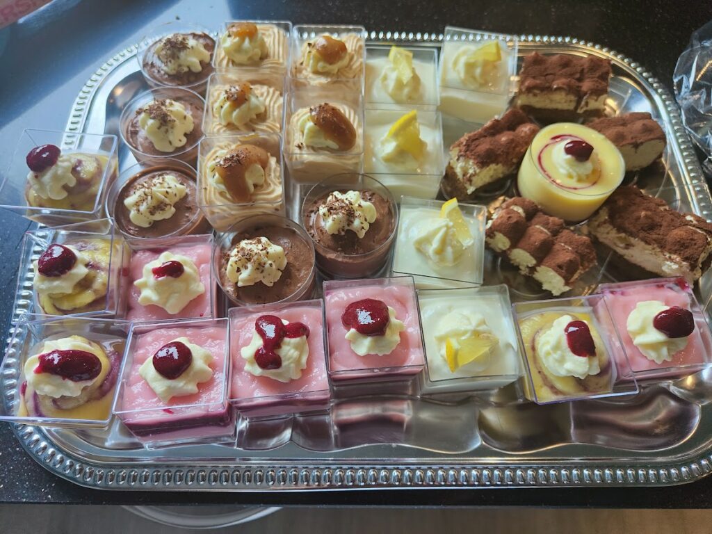 petitfour, cheesecake, kleine donut, snoep, eclair, chocolade, cake, soesje, mini twix, mars of snickers, toetje in glaasje